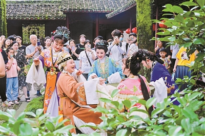 甜润婉转的唱腔萦绕耳畔,飘然欲仙的身段环绕身侧,将游客“拉”进《红楼梦》的剧情里,一起跟随“林妹妹”“宝哥哥”的脚步,成为戏中人、梦中人。